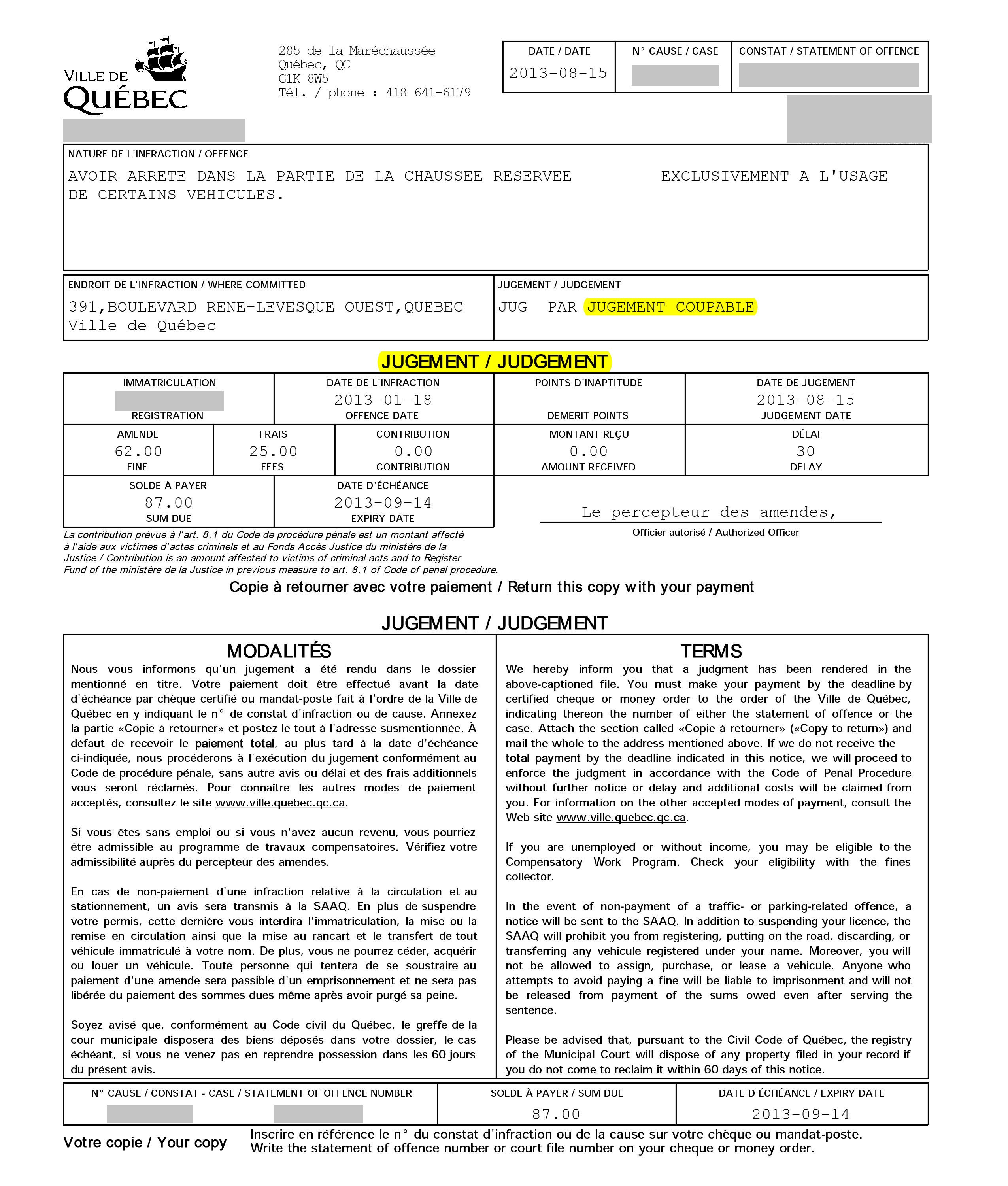 Pour de plus amples renseignements, veuillez communiquer avec le personnel du greffe de la cour municipale par téléphone au 418 641-6179 ou par courriel courmunicipale@ville.quebec.qc.ca.