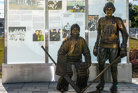 De l’autre côté de l’allée, une œuvre rend hommage aux bénévoles du Tournoi international de hockey pee-wee de Québec, ainsi qu’à deux de ses joueurs-vedettes : Manon Rhéaume et Sylvain Côté. Les sculptures de bronze ont été conçues dans l’infime détail par l’artiste-photographe Guillaume D. Cyr, alors que les textes à l’arrière honorent les joueurs et les bénévoles marquants.