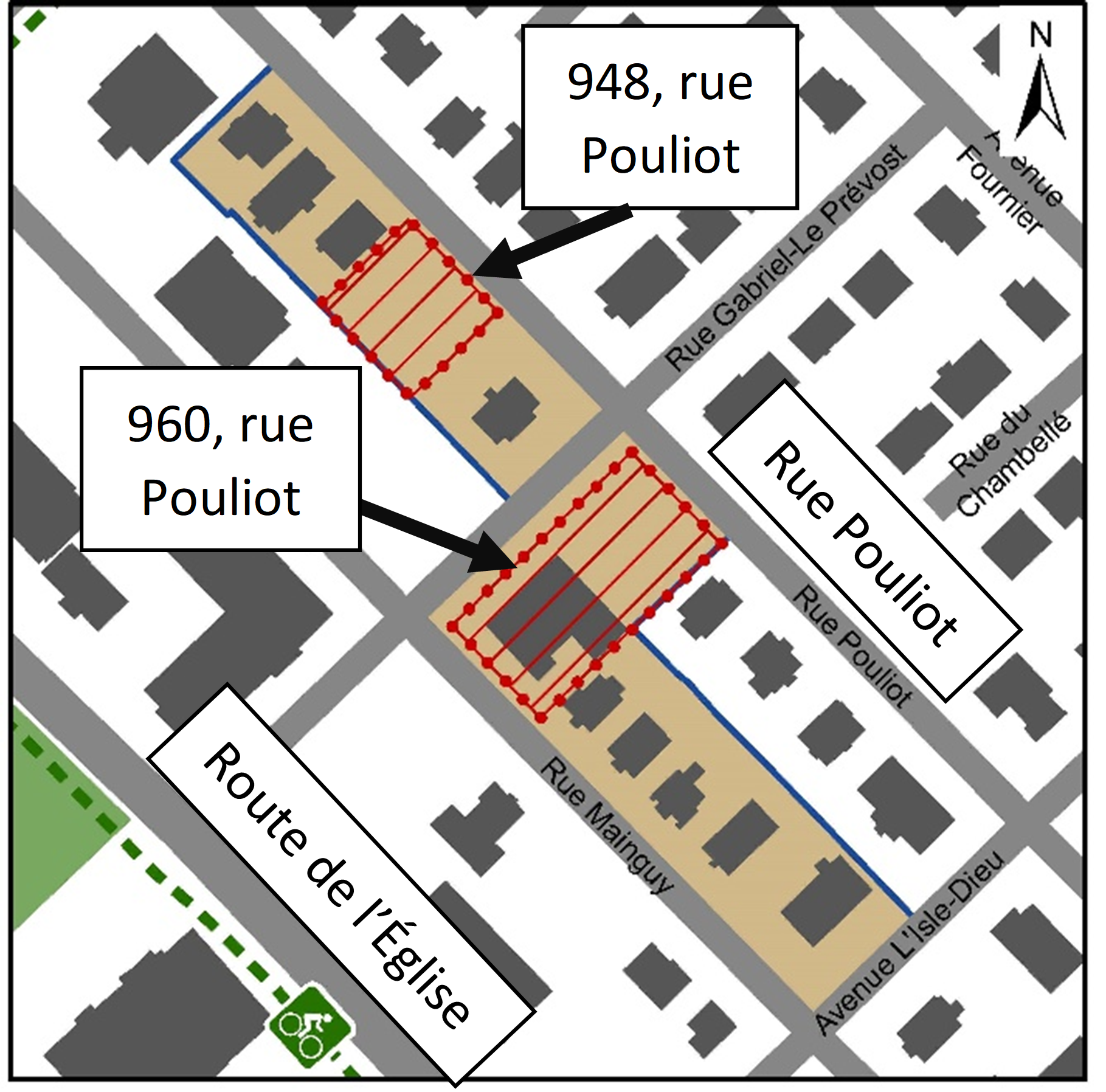 Un requérant souhaite obtenir une permission d’utiliser deux terrains vacants de la rue Pouliot comme stationnement temporaire, soit les terrains situés au 948, rue Pouliot, et au 960, rue Pouliot.