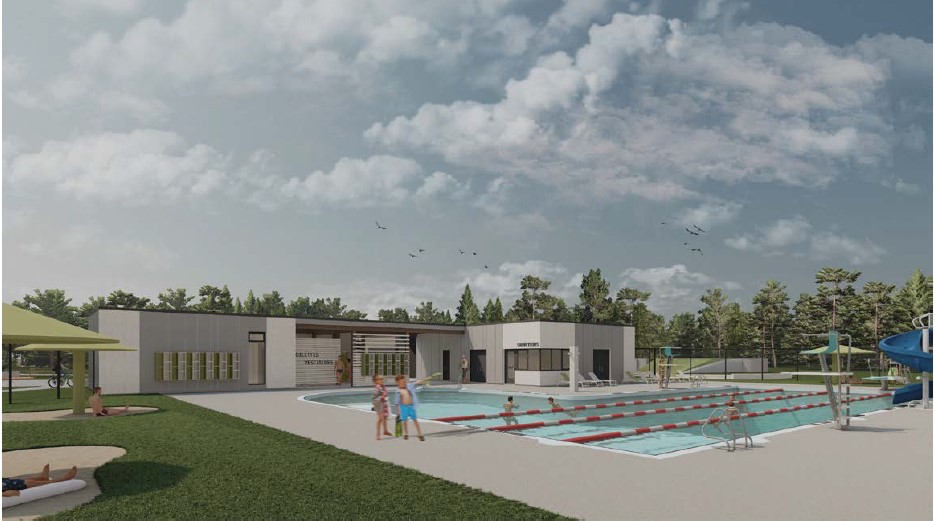 Le projet prévoit également le réaménagement paysager autour de la piscine en y ajoutant des arbres et des espaces de socialisation. Une plage bétonnée avec ombrage ainsi que des liens de circulation vers l'aire de jeux sont également proposés.