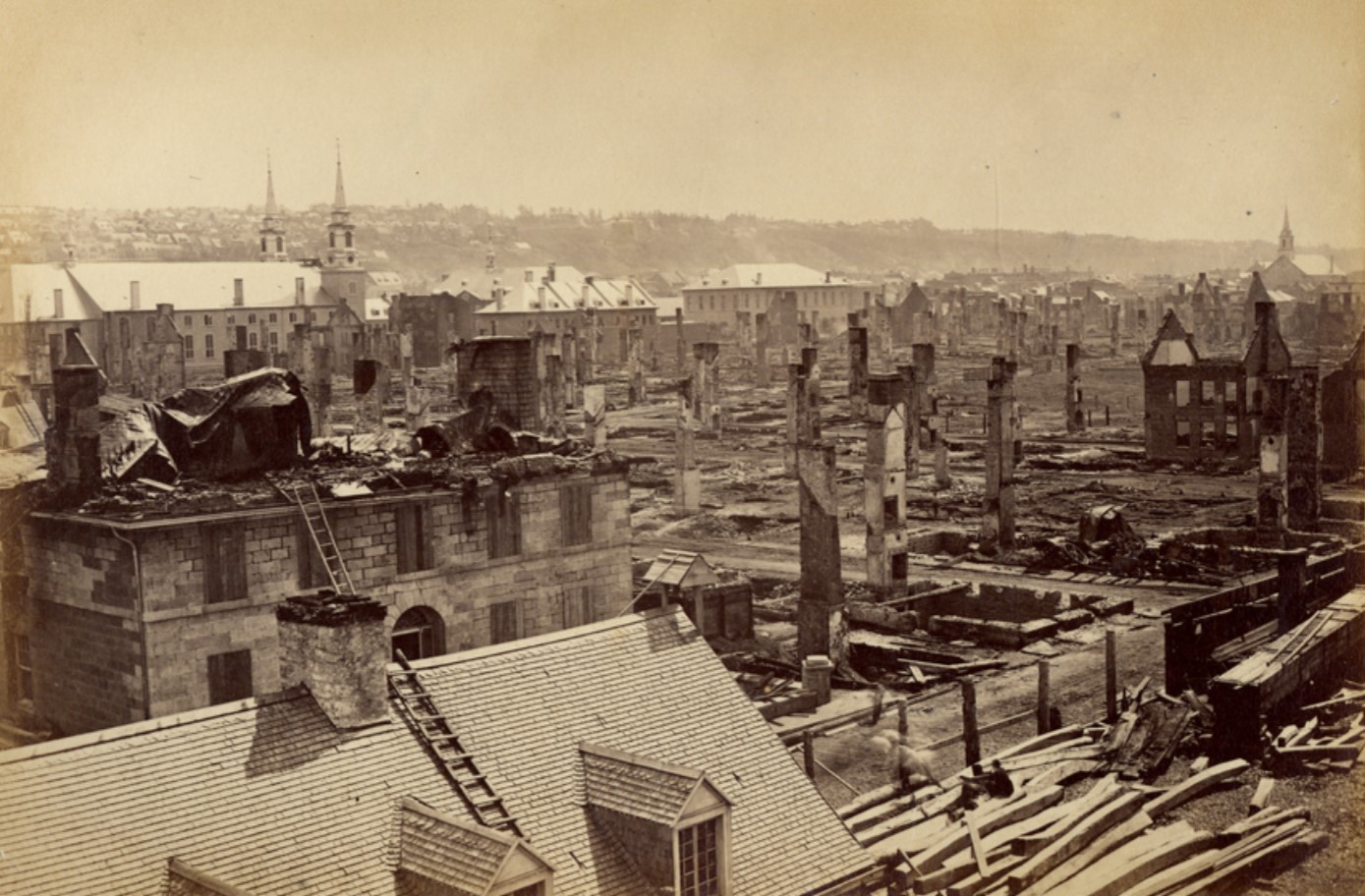 Densément peuplé et construit essentiellement en bois, le faubourg Saint-Roch subit des incendies dévastateurs en 1845, 1866 et 1870. Afin de prévenir la répétition de ces désastres, l’administration municipale resserre la réglementation en exigeant l’emploi de matériaux incombustibles lors de la reconstruction. Cela a pour effet de favoriser la construction de bâtiments en pierre ou brique. À la suite de ces grands incendies, le cadre bâti demeure largement similaire à celui d’avant 1845 puisque, faute de moyens, bon nombre d’habitants se reconstruisent en bois, malgré le risque encouru. C’est le cas du 734-736, rue De La Salle, construit en bois quelques années après l’incendie de 1845.