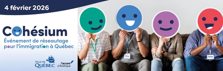Le 4 février 2026, participez à Cohésium, un événement de réseautage pour la réussite de l’immigration à Québec! Rencontrez des gens des milieux des affaires, communautaires et de l’éducation et participez aux discussions entourant l’accueil, l’intégration et l’inclusion des personnes immigrantes. Pour plus d’information et vous inscrire, consultez la page Web de l'événement.