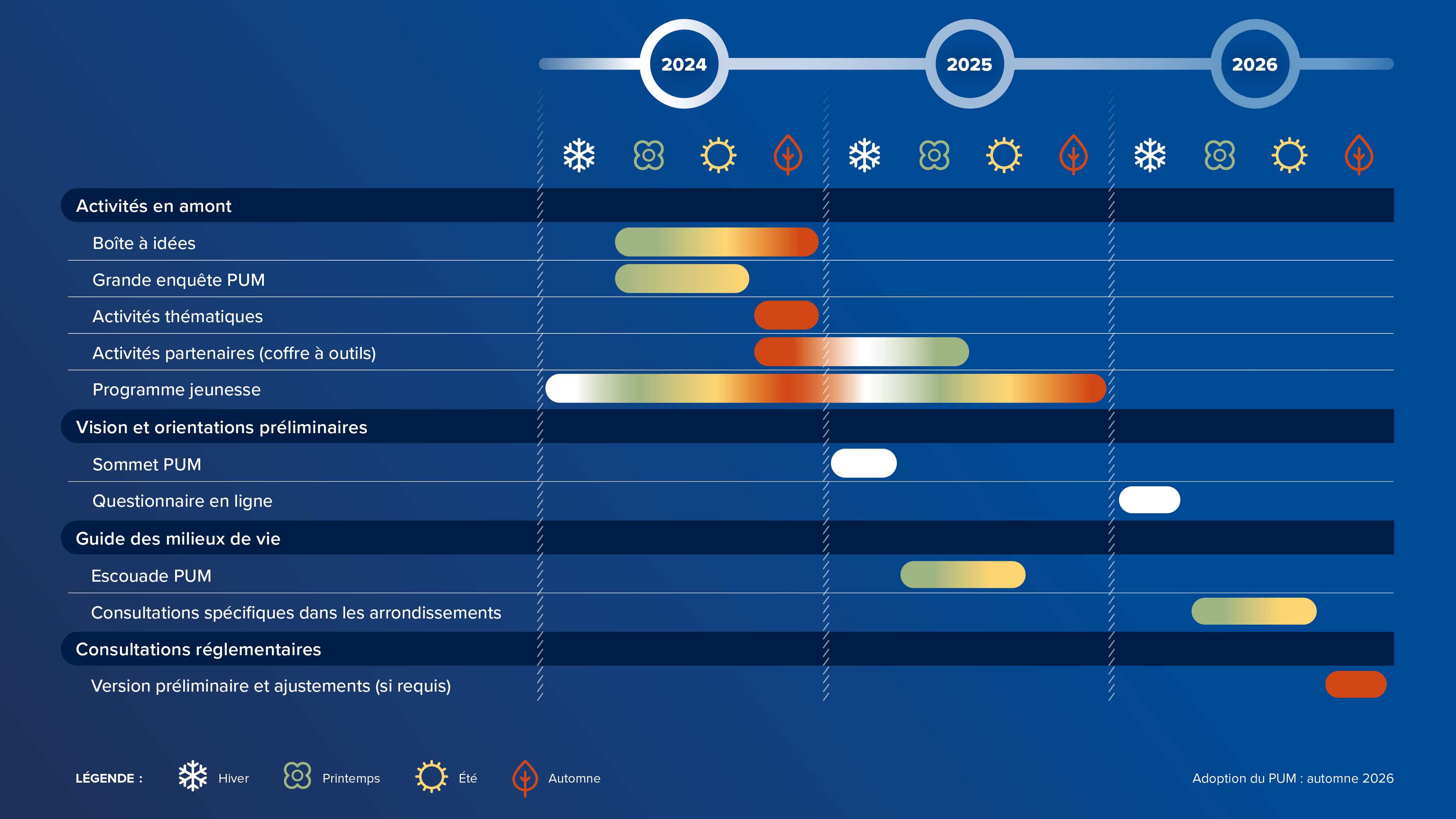 Un plan d’urbanisme et de mobilité sert à prévoir le développement de la ville à long terme et permet de guider la prise de décision quant à l’aménagement de son territoire et à la mobilité. Le futur plan permettra de construire, organiser, entretenir et transformer les quartiers. Il permettra de mettre en valeur nos milieux naturels et nos éléments patrimoniaux et identitaires. Il doit considérer les enjeux actuels et à venir en matière d’habitation, de changements climatiques, de transport, de sécurité, etc.